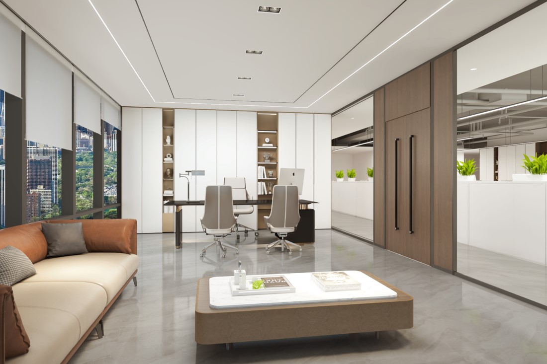 设计介绍:主要展示前台、洽谈区、走廊、贵宾区、会议室、办公区等各个区域办公室装修效果图,设计师们根据不同楼层采用采取不同办公室装修风格,现代简约、庄重凝练两种风格相互融合,主要以白色为主,更符合的公司形象。