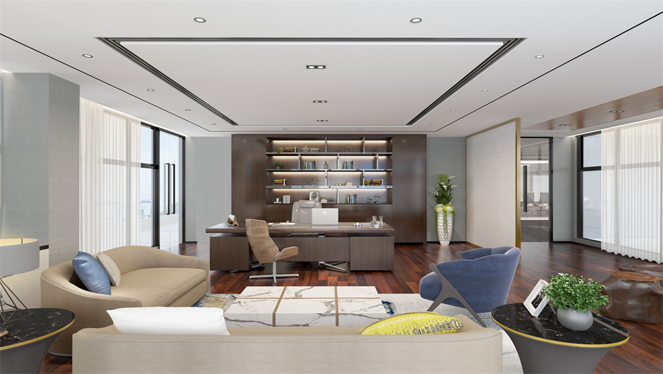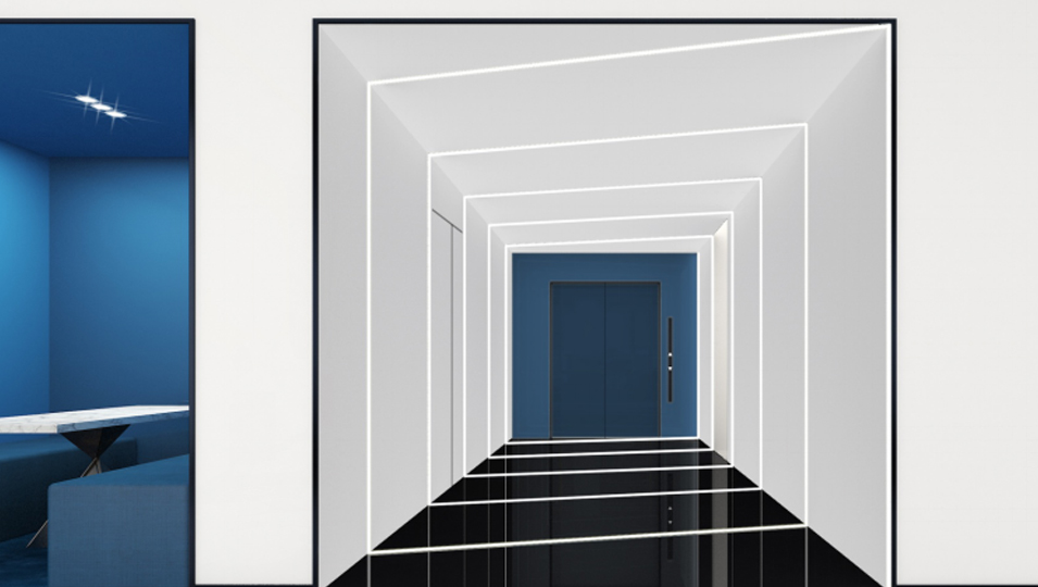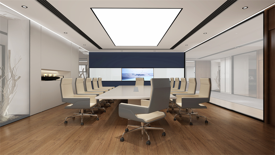 设计介绍:主要展示前台、洽谈区、走廊、贵宾区、会议室、办公区等各个区域实物图,设计师们采用现代简约风格办公室设计,主要以白色为主,蓝色更符合智能化科技的公司形象,通过几何图形与条纹装饰打造科技智能的办公空间。