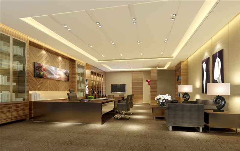 2)办公室也可以给人的是一种高档、豪华的感觉。白色的石膏板吊顶搭配黄色的微晶石背景墙显得非常的和谐,整个办公室在暖黄色的灯光照耀下显得非常的奢华,大气,展现出公司的实力。