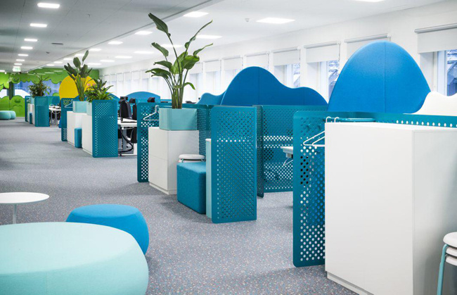4、动漫公司办公室装修:以一个开放式的办公环境为宗旨,旨在培养员工的团队协作能力和沟通能力,而随处可见的沙发座椅大大方便了员工之间的沟通交流。放松心情的办公氛围也使得灵感随时都有可能迸发,公司员工能够享受到以任何自己喜欢的方式进行灵感的创作。除了主要的工作区域,办公室的其他功能区也各具特色。以天然绿色为背景的图书馆能够为员工提供宁静安逸的阅读空间,另外还有包括蹦床、球类等让员工可以尽情玩乐游戏室,闲暇之余聊天放松的咖啡厅。而餐厅的设计有吸引力,将餐厅设计成一个复古的美式游乐园,摇椅或旋转木马般的座位,极具童心童趣。